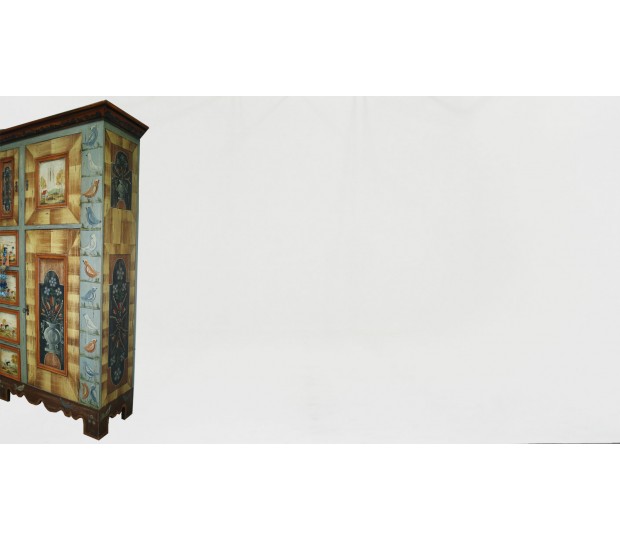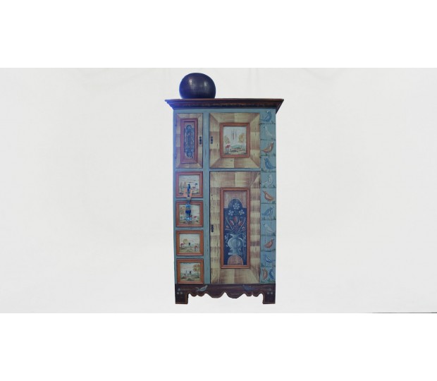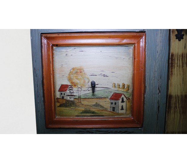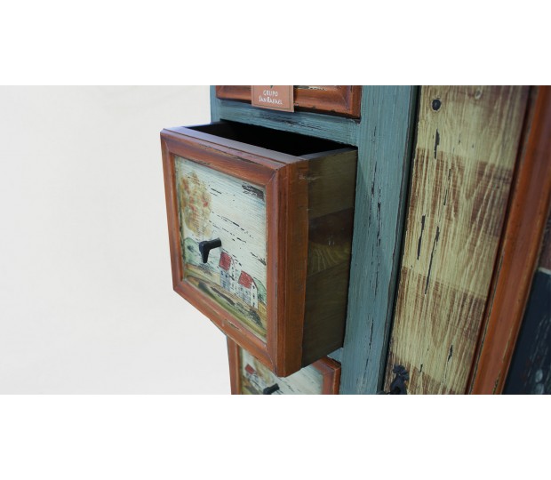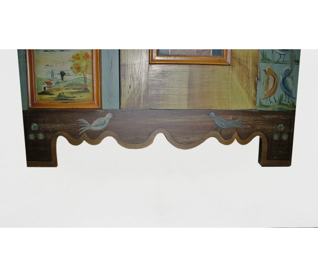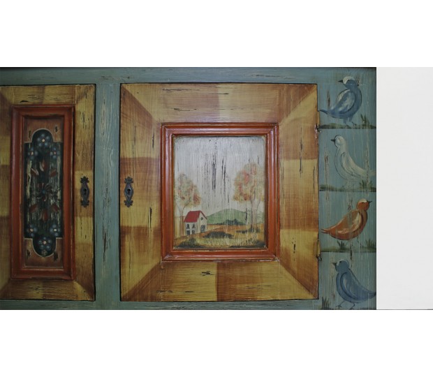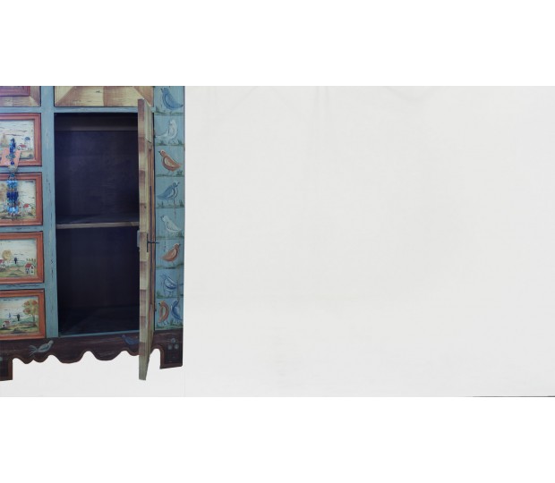 Excepcional armario aparador fabricado y pintado a mano. Se trata de una pieza única, realizada en madera, con un diseño naif. En la parte superior tiene dos puertas de distinto ancho, que cierran un hueco corrido. En la parte inferior se dispone otra gran puerta que cierra un amplio hueco separado por una balda, y cuatro cajones. Cada una de las puertas y frentes de cajón están pintados a mano con diferentes motivos, bien paisajes, bien bodegones. Multicolor, se trata de un mueble que resalta, y dota de personalidad cualquier estancia en la que se ubique.