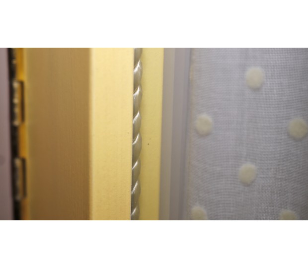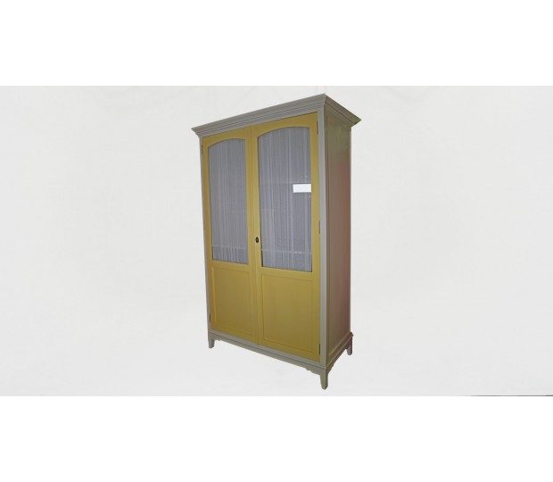 Pieza única realizada de manera artesanal en madera de primeras calidades. Terminación en laca de poliuretano color blanco patinado y de color vainilla. Dos puertas cristaleras con visillo cierran el hueco del armario, dividido en dos partes, con barra colgador en la superior.