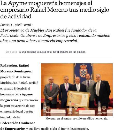 Muebles San Rafael celebra este año 2016 su 50 aniversario, fundada en 1966 por Rafael Moreno Domínguez, es una empresa familiar con experiencia en el sector del mueble. Galardonada en varias ocasiones con el premio master selección a la Calidad.