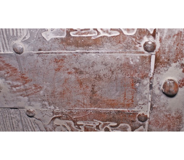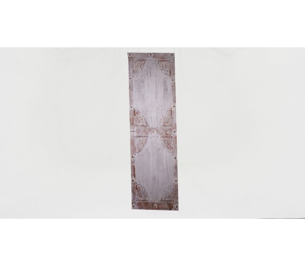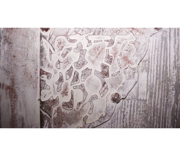 Cuadro díptico imitando una puerta rústica de dos hojas, muy texturada, en tonos blancos, rojos y ocres, con incrustaciones matéricas. Personal e impactante, perfecto para decoraciones heterogéneas. Se pueden disponer ambas piezas juntas o separadas.