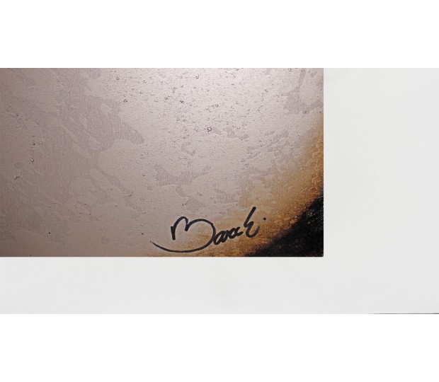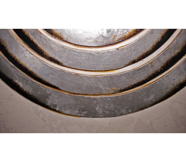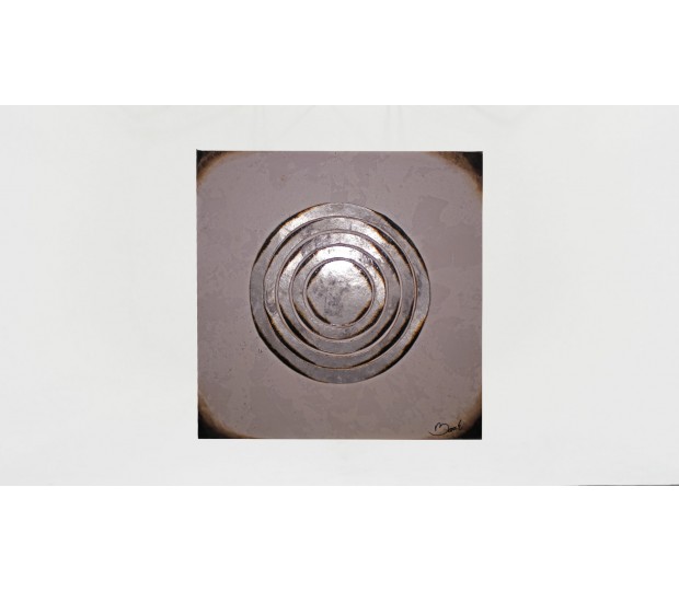 Obra original. Sobre un fondo color tierra cinco círculos concéntricos metálicos. Un mandala, un centro. La geometría de la pieza invita al sosiego y la introspección.