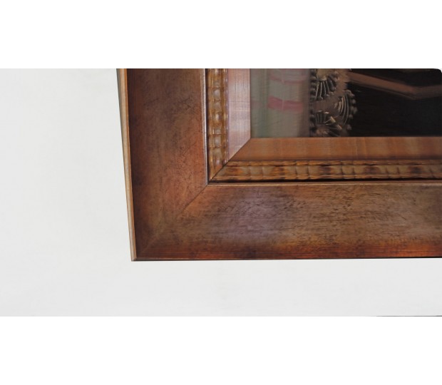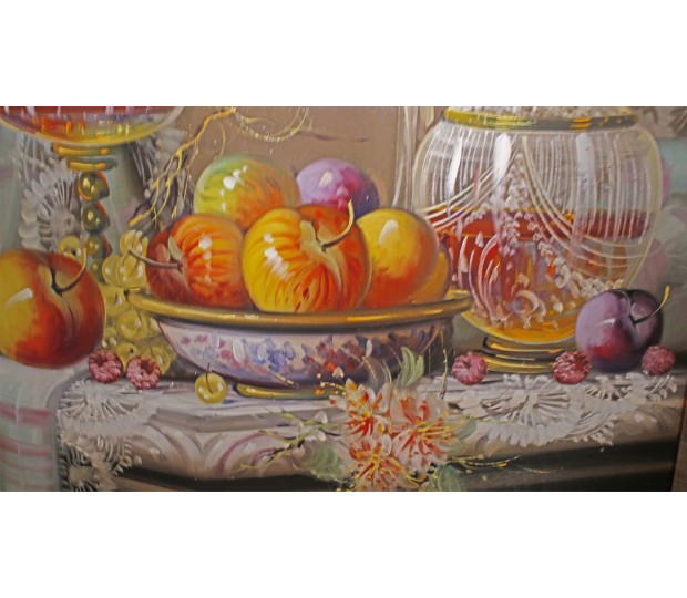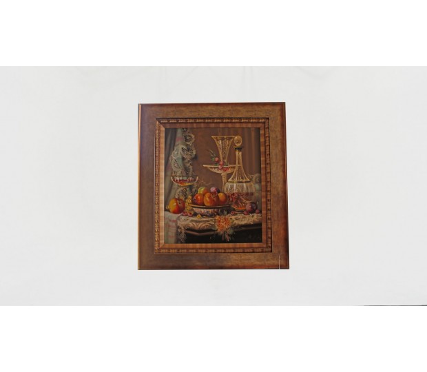 Bodegón clásico, oleo sobre lienzo, colores cárnicos y oscuros. Incluye el marco de madera, con talla e ingletado. Sin pasapartú, el cuadro entrega directamente sobre el marco.
