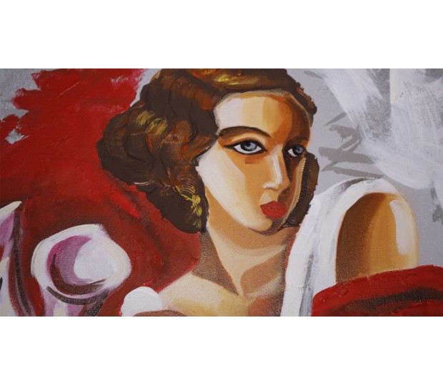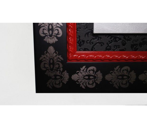 Retrato de mujer con vestido blanco, pintura al oleo, enmarcado con una caña negra serigrafiada con motivos florales grises, moldura roja enmarcando la caña del marco en su parte central.