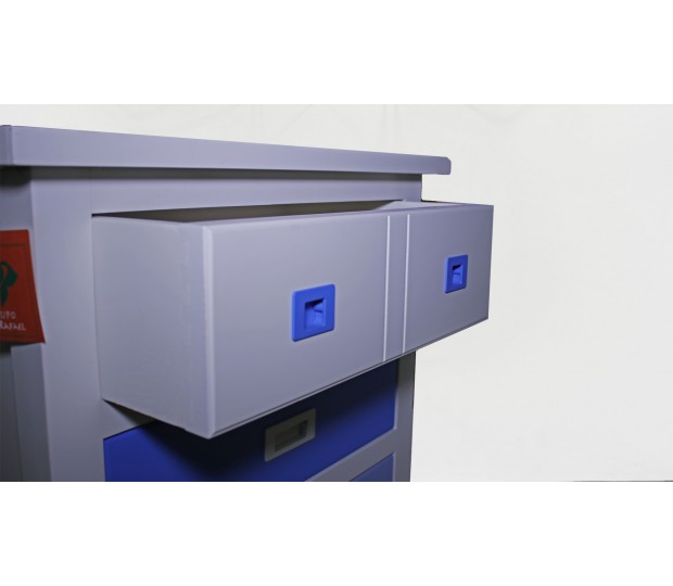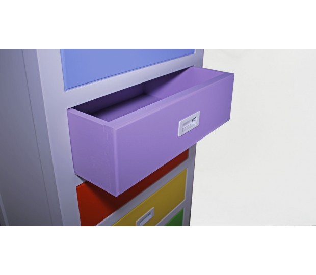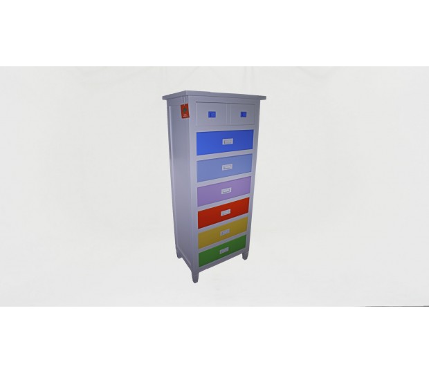Divertido xinfonier infantil realizado en madera maciza. El sobre y los laterales están acabados en laca blanca, y dispone de siete cajones de gran capacidad, cada uno de ellos con el frente lacado en un color distinto creando una alegre combinación. Los tiradores están encastrados en los frentes.