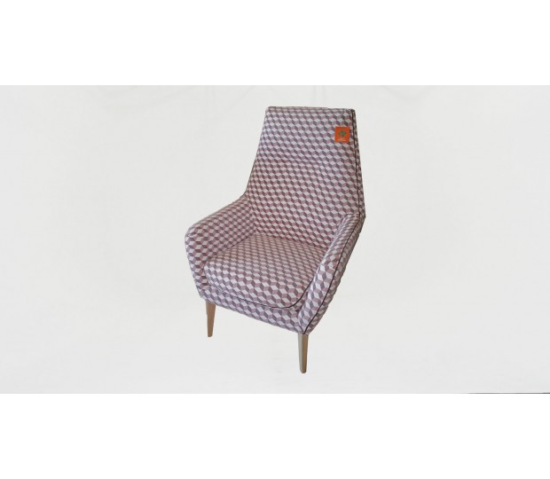 Butaca fija de diseño nórdico, tapizada en chenilla con un estampado de cubos geométricos, en colores rosa, blanco y marrón. Patas agujadas de madera de haya barnizada natural.