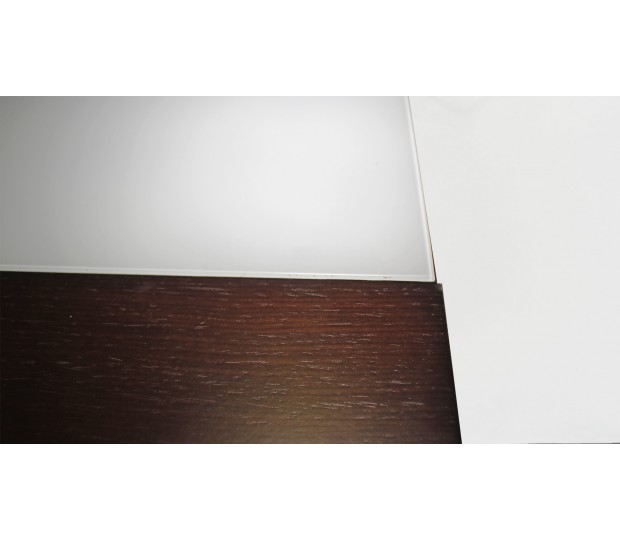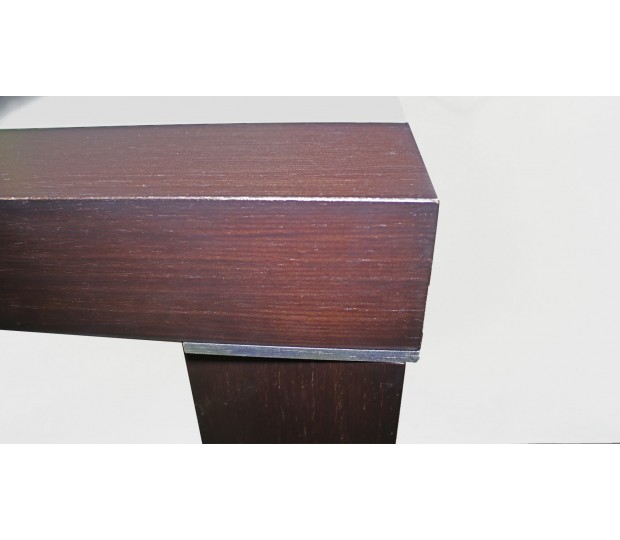 Magnífica mesa de comedor extensible, de gran calidad en el acabado. Emplea materiales como la chapa de cerezo teñida en wenge, el cristal templado lacobé blanco y pan de plata en las entregas de las patas al sobre. Maciza y airosa a la vez, se convierte en una gran mesa cuadrada, separando los laterales largos y desplegando el panel de oculto en el sobre.