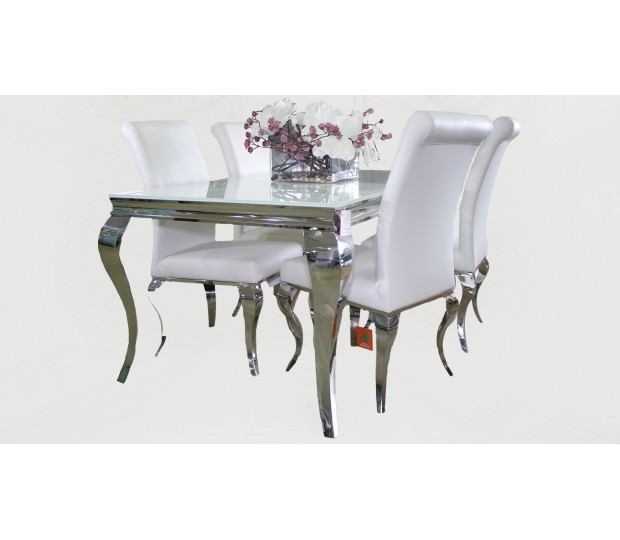 Mesa de comedor fija, estructura de acero inoxidable con diseño clásico isabelino, sobre en cristal templado con acabado lacobé blanco.