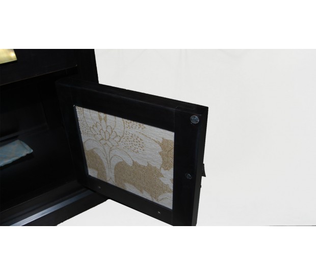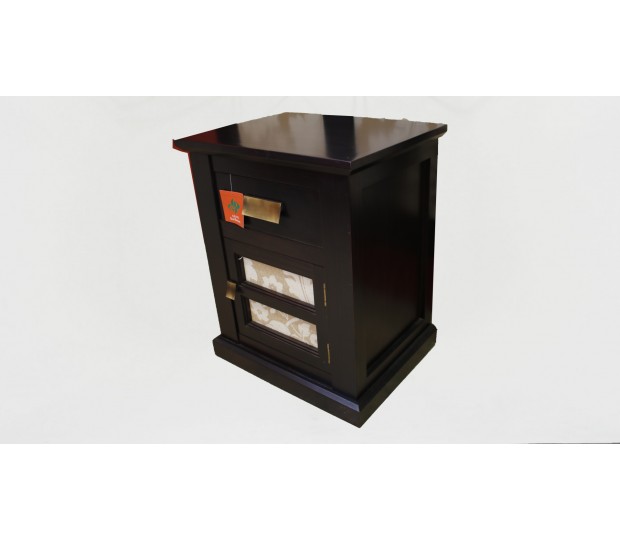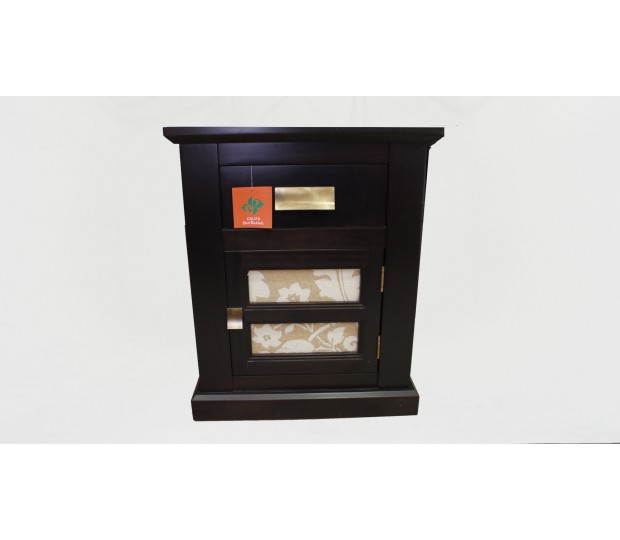 Sobria y elegante mesita realizada en madera acabada en wengé, con un cajón visto y puerta con palillería y dos plafones tapizados en tela crema estampada con bellos motivos florales de fantasía.